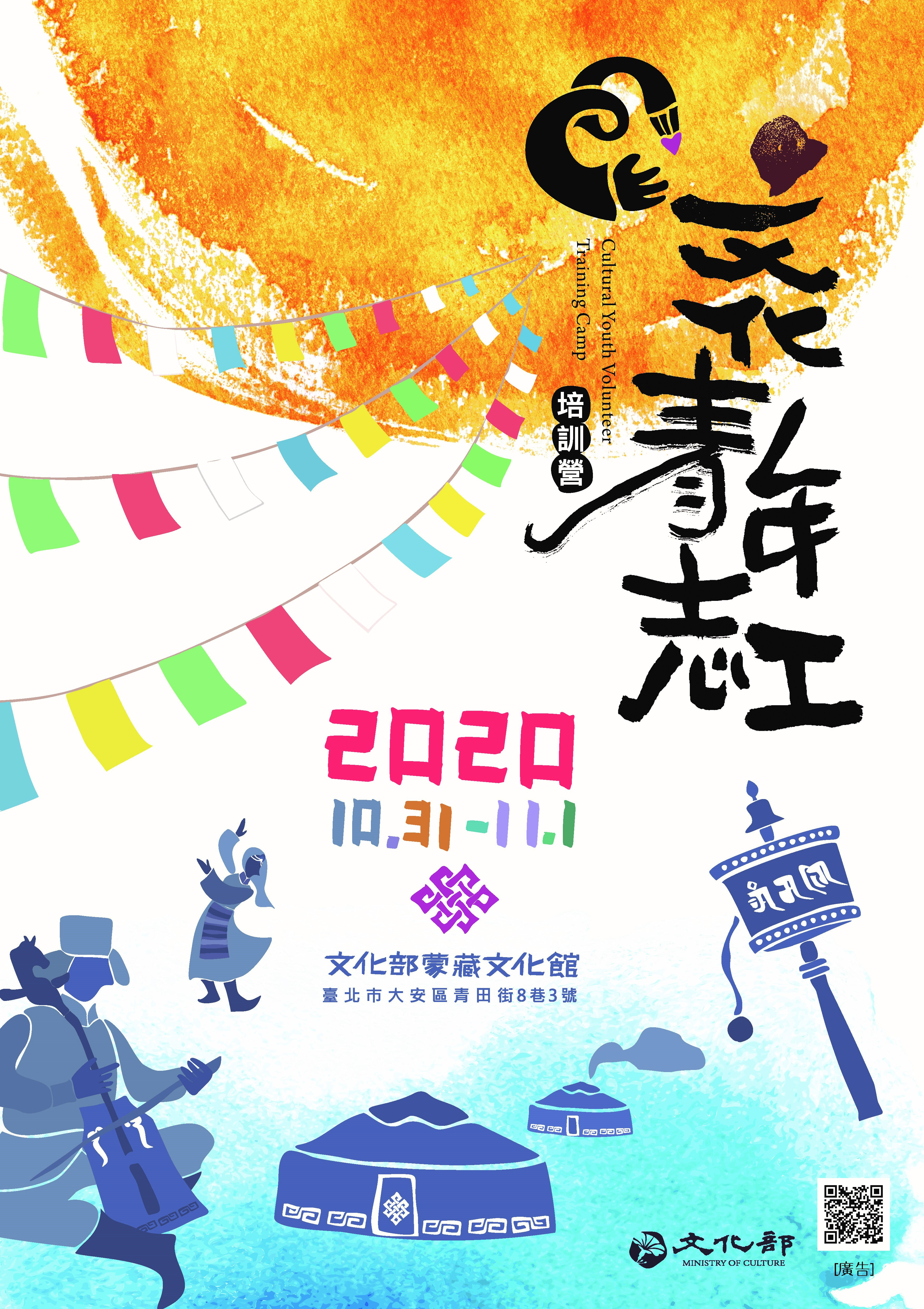 為帶動臺灣青年走向世界,放眼國際,關懷多元族群事務,文化部特別於109年10月31日至11月1日於文化部蒙藏文化館(臺北市大安區青田街8巷3號)規劃辦理「文化青年志工培訓營」,即日起歡迎15歲至35歲對志願服務有興趣青年報名參加!