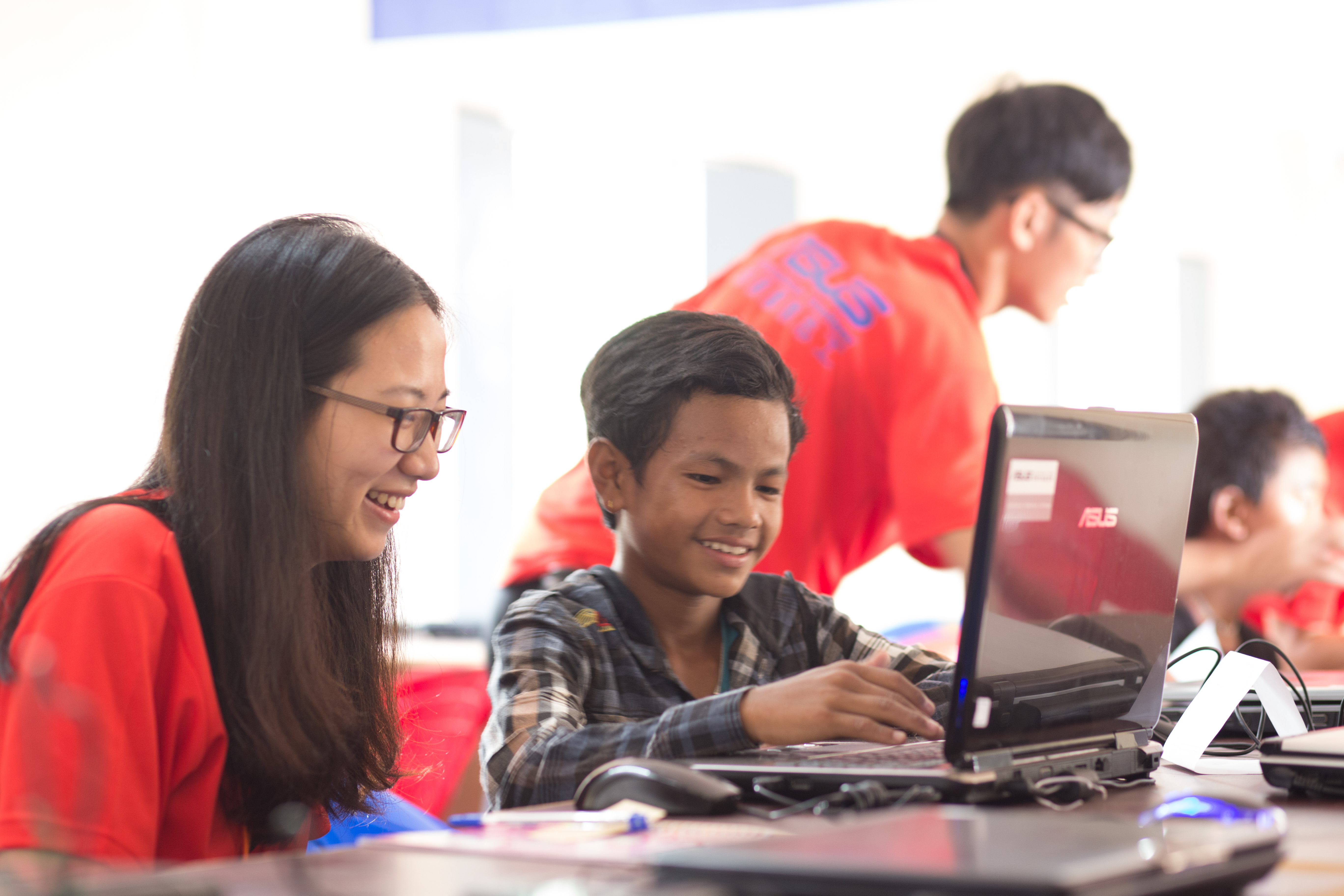 團員段鑫杰(左1)使用華碩華碩文教基金會捐贈的再生筆電,教導當地學童如何使用操作基本軟體。