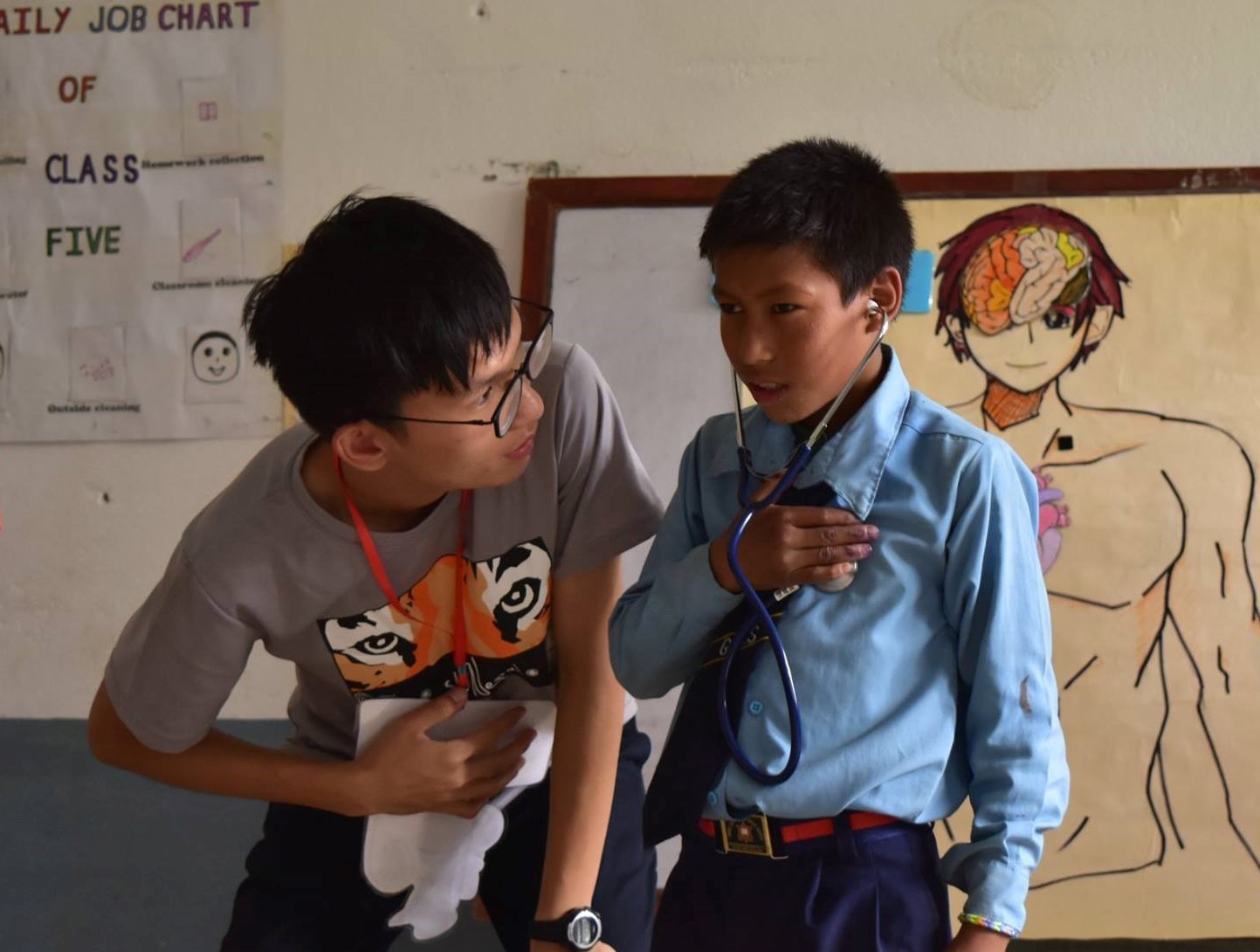 國防(尼泊爾)團員謝士博正在進行衛教課程,讓學童聽自己的心跳聲,協助認識身體器官。