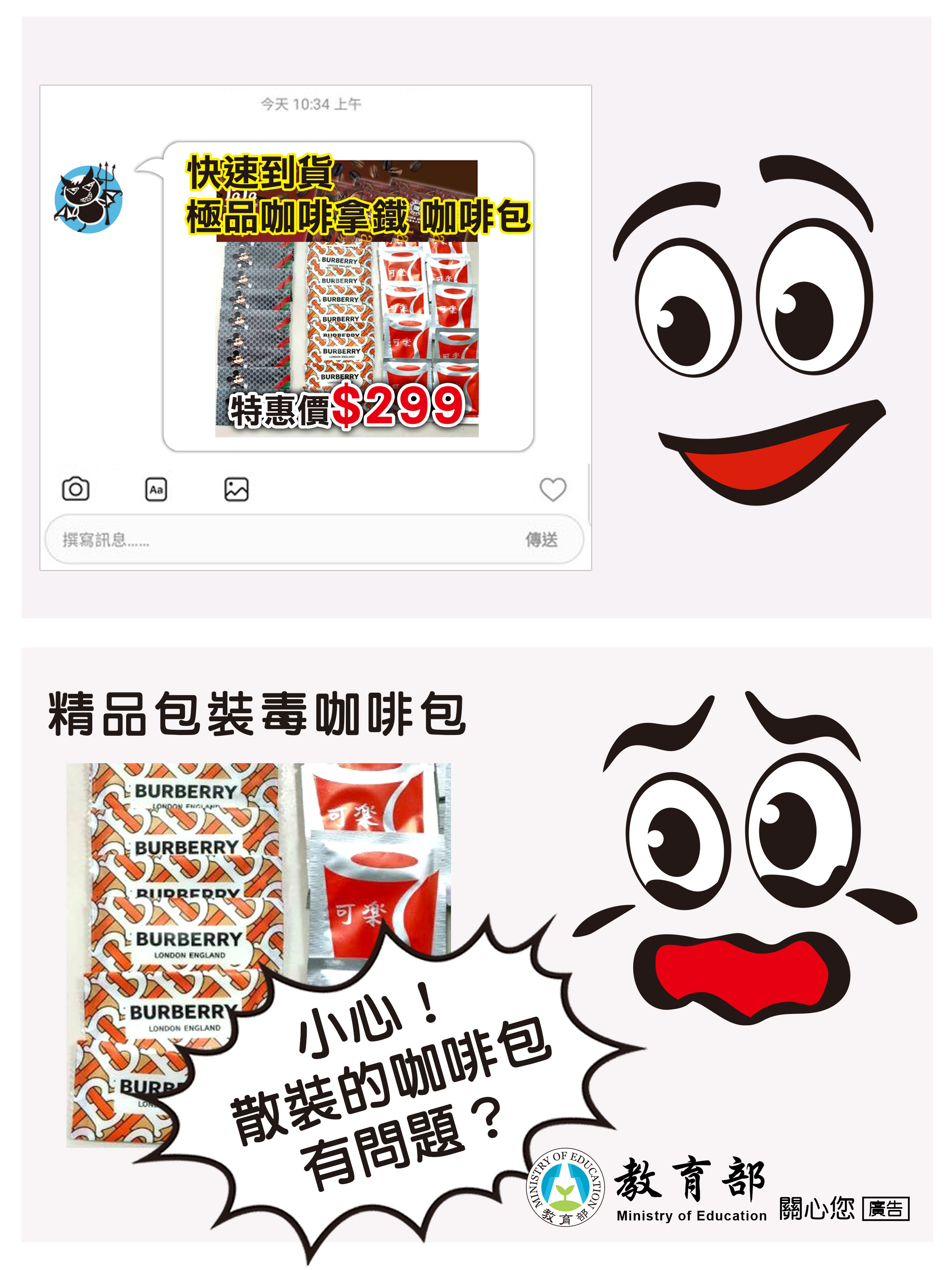 小心!散裝的咖啡包有問題?(教育部宣導海報)