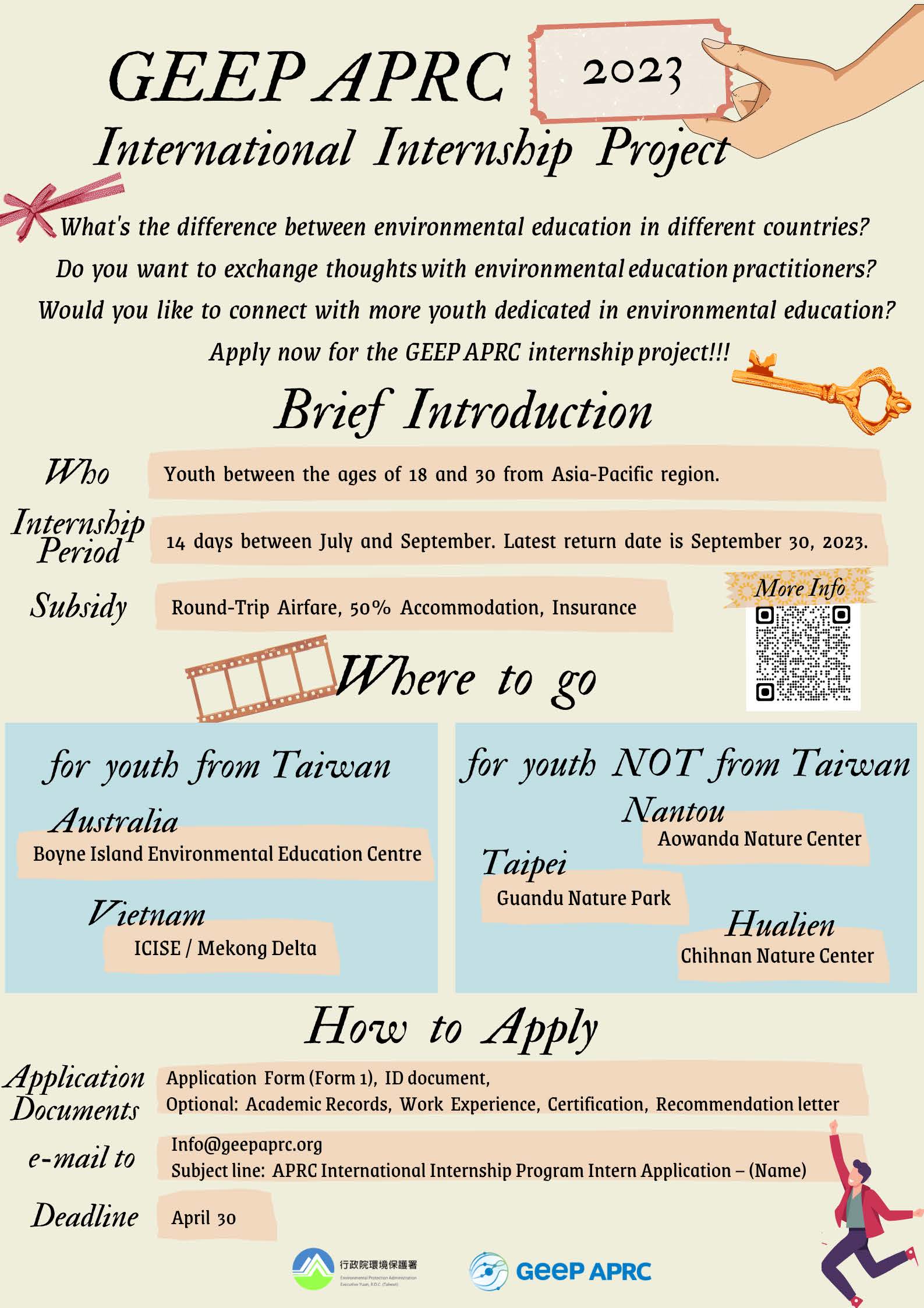 行政院環境保護署為促進亞太區域之國際環境教育交流與合作,並提供青年跨國學習及服務機會,增加環境教育實務經驗並體驗多元文化,於本年度試辦旨揭計畫,提供我國青年至亞太區國家環境教育場域實習機會,參與環境教育推廣、考察經營管理實務。期許各國青年能在學習與服務中並進,貢獻自我專長、相互合作,協助實習場域之環境教育工作,並於回國後將所學經驗分享並融入後續環境教育行動中。