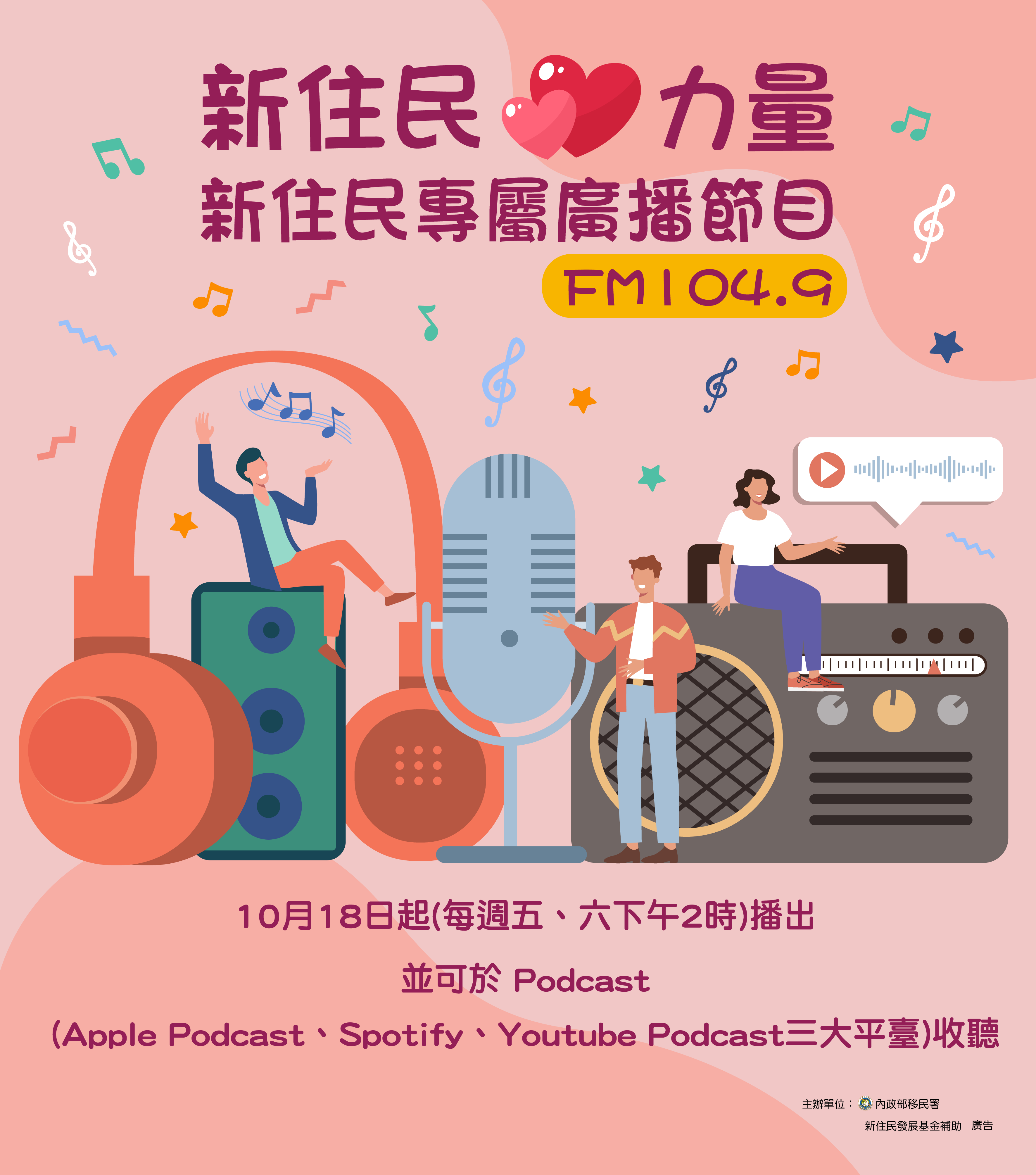 「新住民心力量」廣播節目節目自113年10月18日起,於每週五、週六下午2時於內政部警政署警察廣播電 臺FM104.9頻道播出,歡迎收聽。
