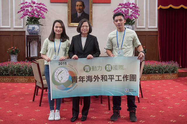 蔡英文總統頒贈青年海外和平工作團旗幟,由楊欣瑜(左1)及吳聖凱(左3)2位青年代表受贈