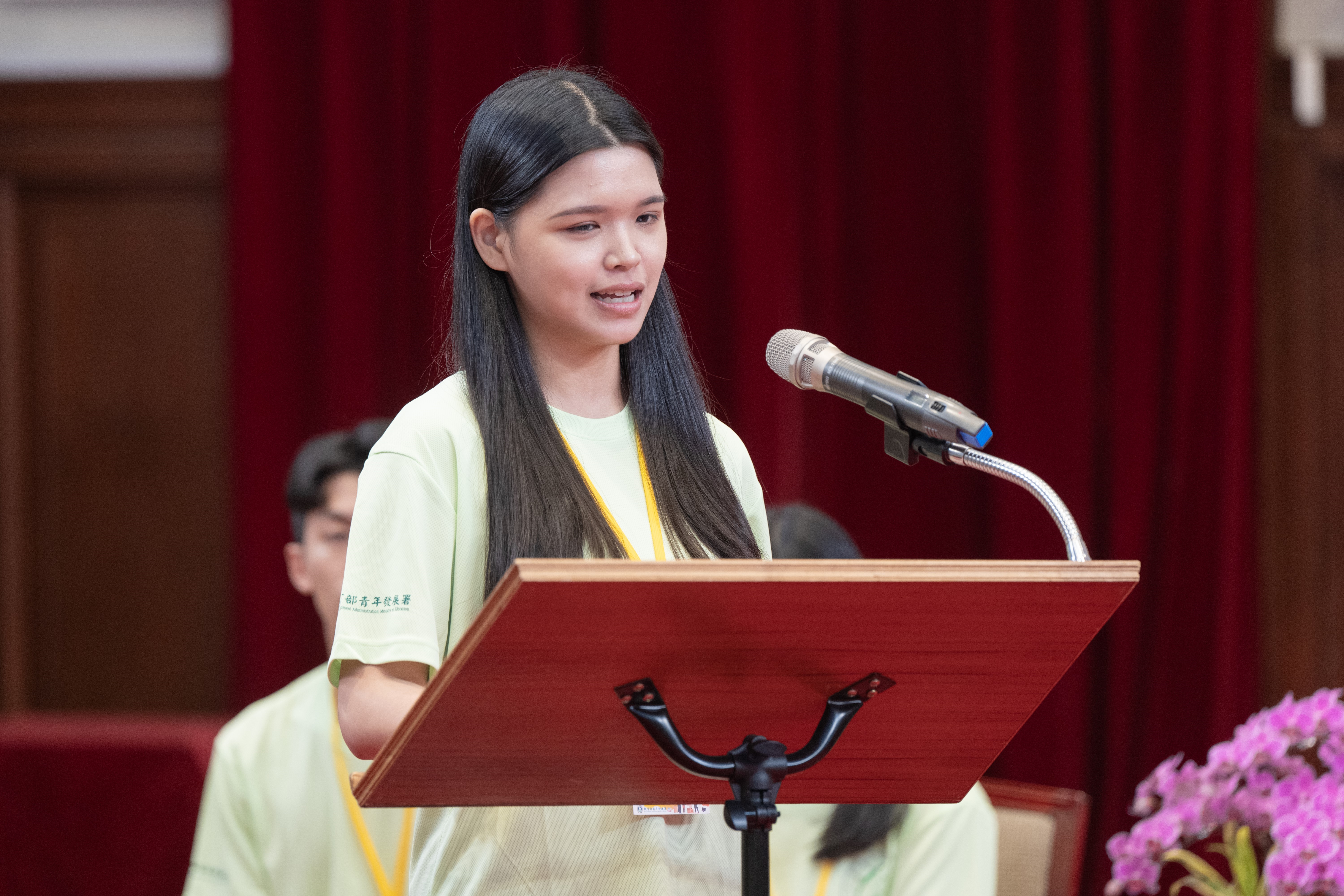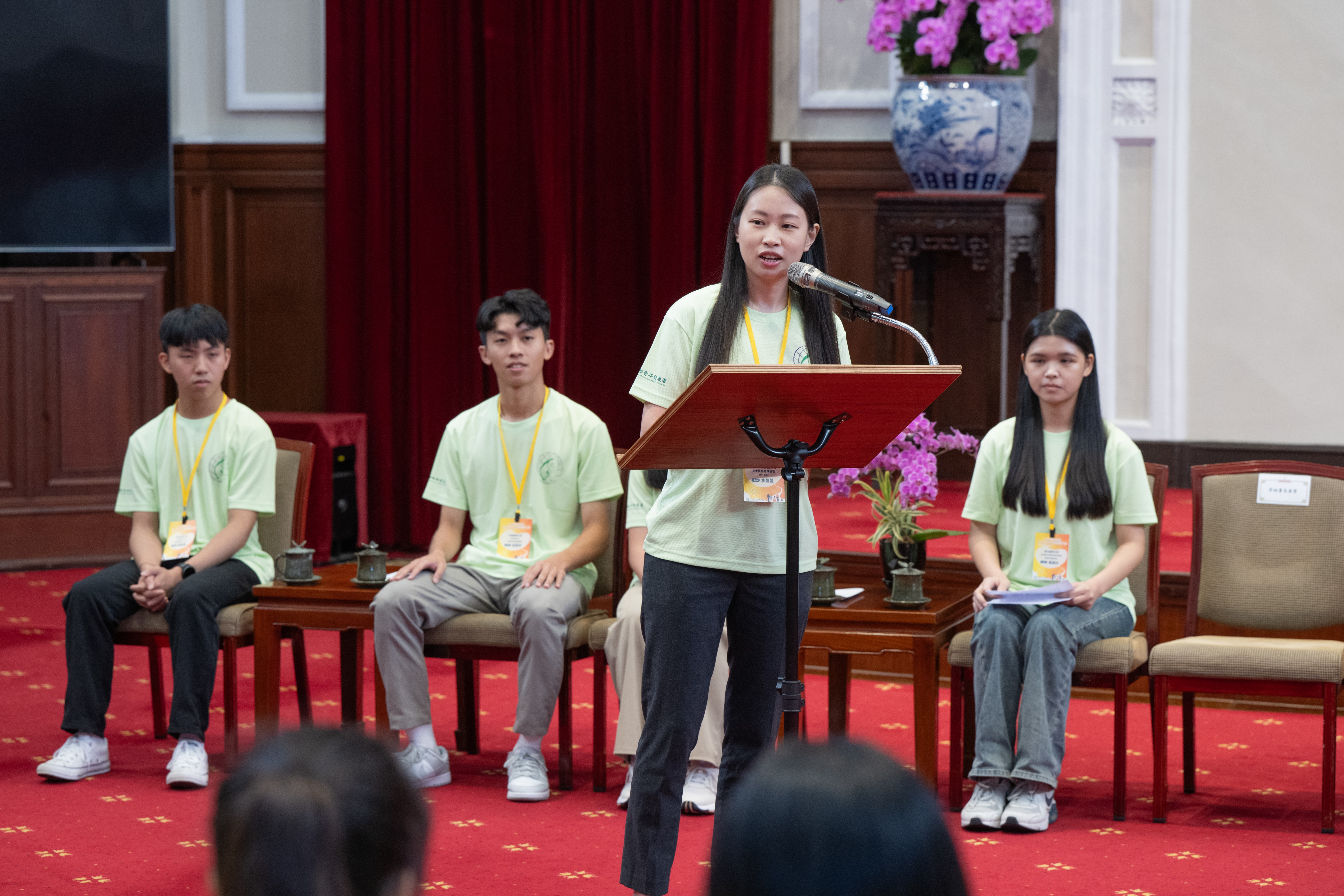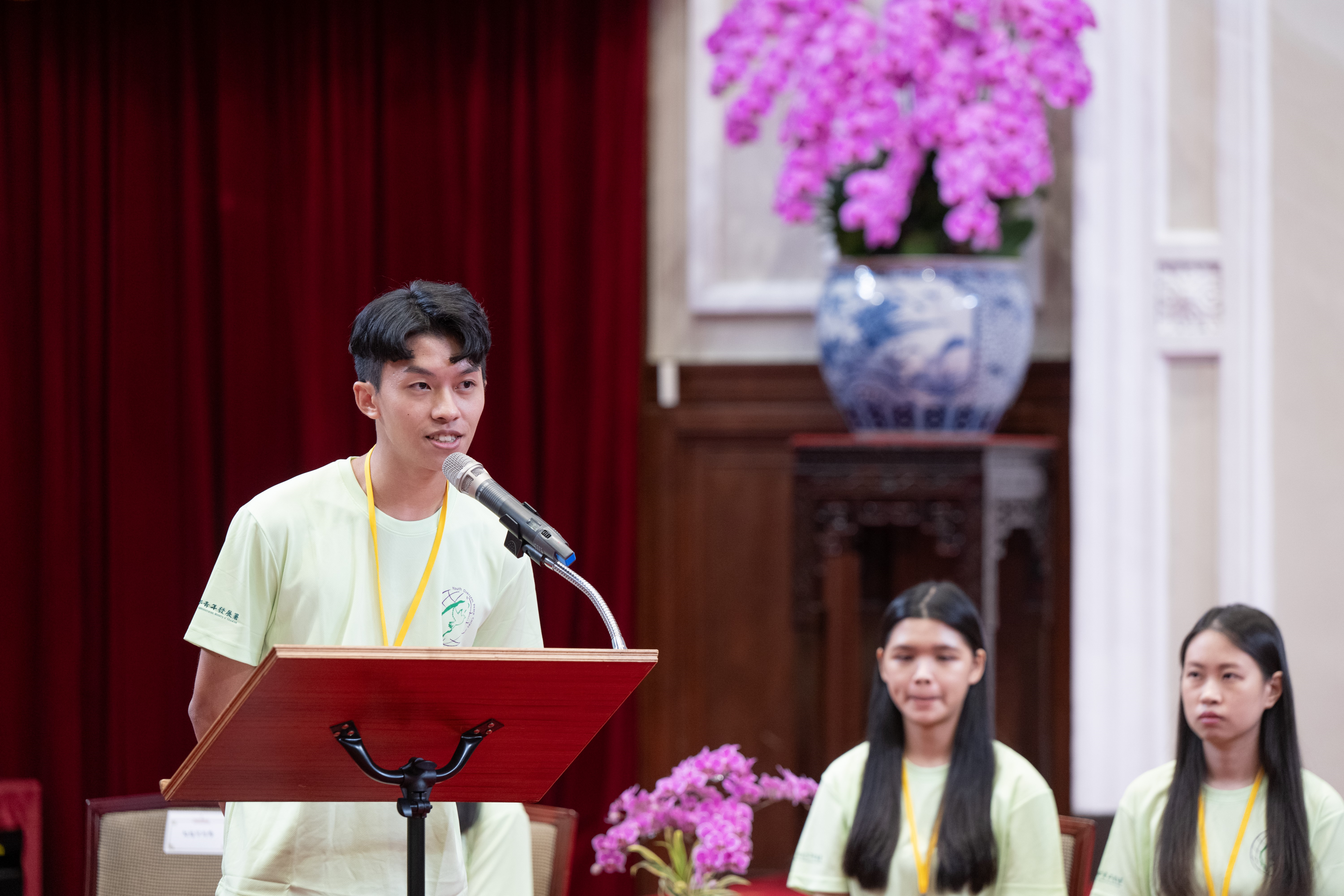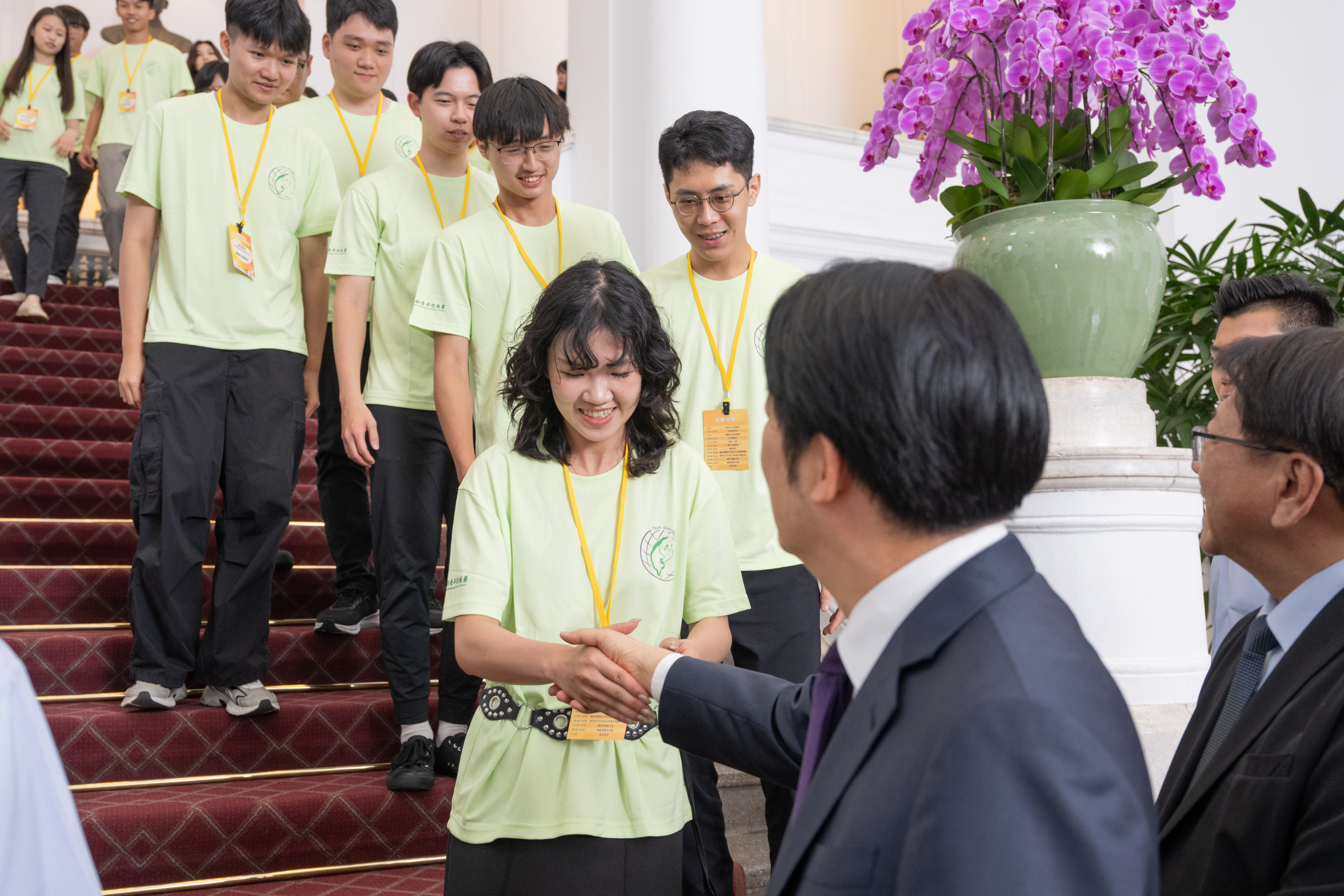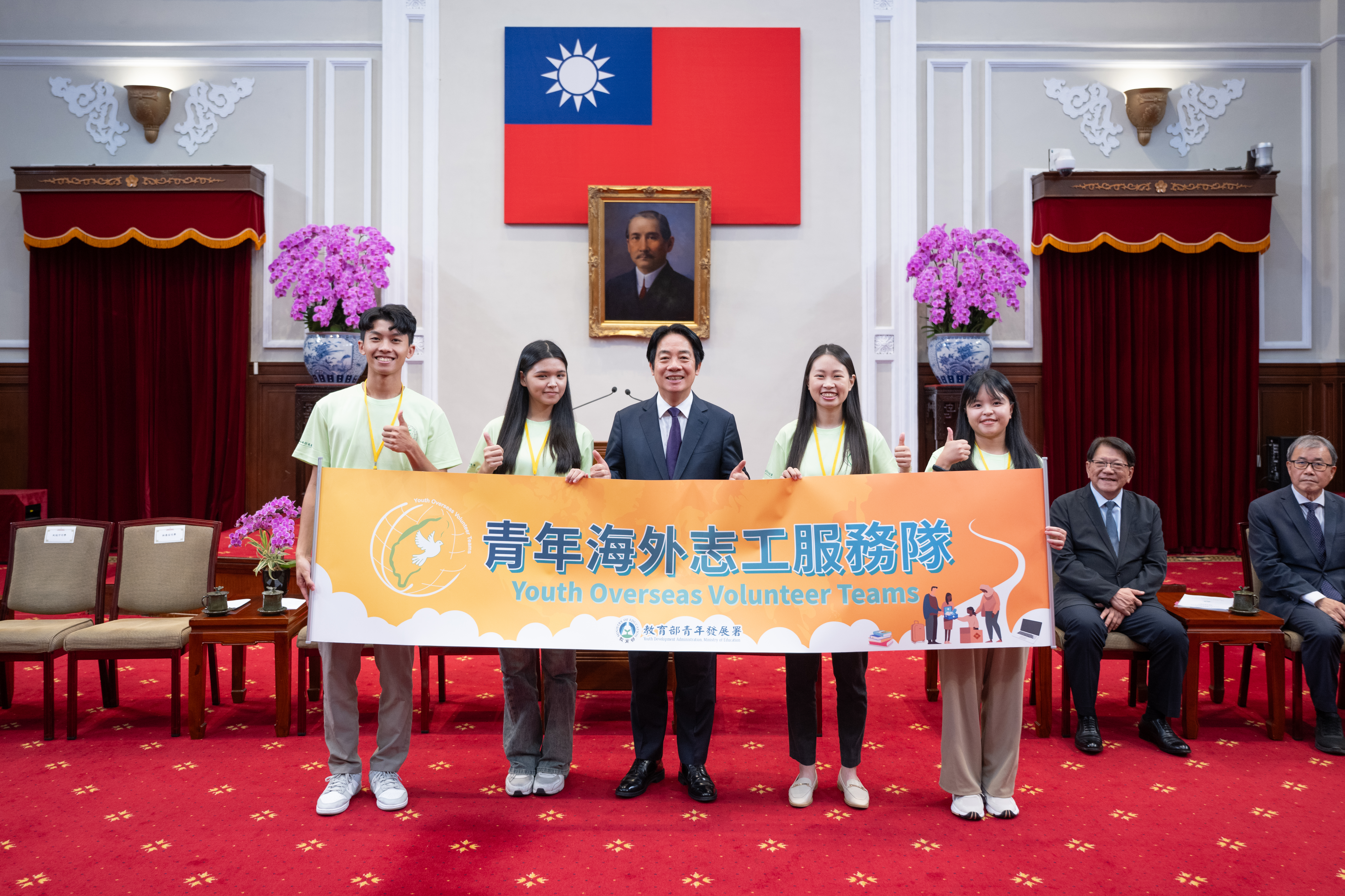 青年海外志工服務隊一行由教育部長鄭英耀及青年發展署署長陳雪玉陪同晉見總統,現場有4位青年志工分享了海外志願服務的經驗。非營利組織《樂。斯屬》創辦人李盈萱擔任國際志工多年,認為志願服務最大的價值就是知道自己有能力把愛帶給世界,是一個用生命去影響別的生命的機會,只要帶著對世界的尊重和好奇,和解決問題的勇氣,終將創造影響力。臺北醫學大學《飛洋國際服務團》吳閩卉,分享短期服務或許有許多無法突破的上限,但透過一屆一屆的交棒,在服務地點長期耕耘,讓困難的事慢慢變得容易、能讓難以達成的事慢慢被完成。國立陽明交通大學《印度國際志工Jullay團》林喬安深信教育的力量不是瞬間的震撼,而是長久的陪伴與記憶。中國醫藥大學《口衛隊海外醫療服務團》紀冠宇也說明團隊與當地學生合作,將希望的種子在當地種下,真正地將影響力跟臺灣的關心留在當地。