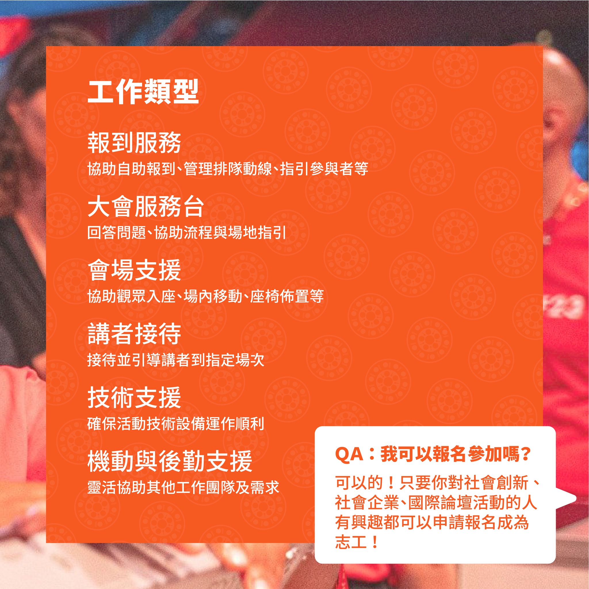 4、志工福利:免費參加論壇、門票價值新臺幣2萬2,000元、國際志工證明以及與全球創新者交流。