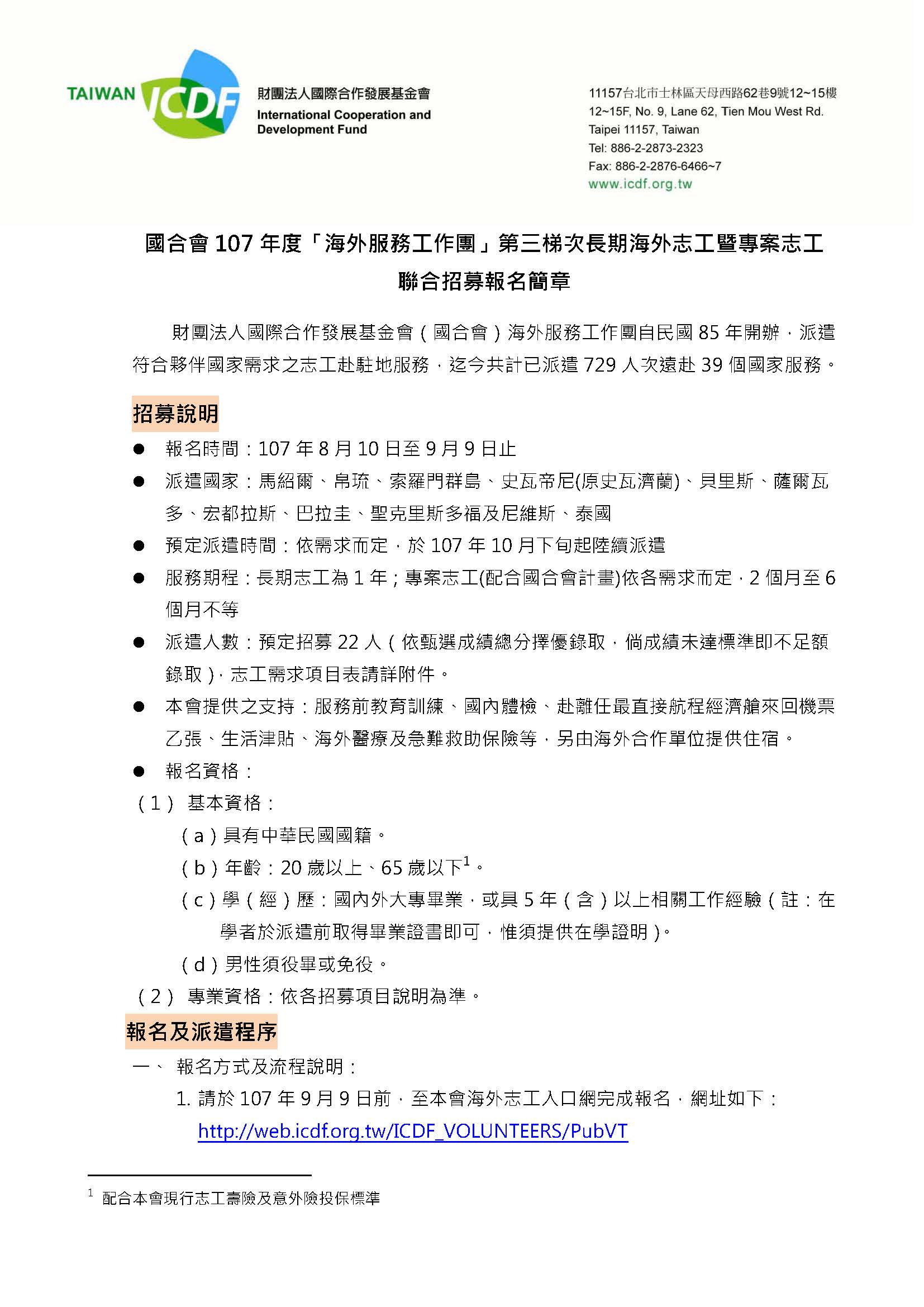 團法人國際合作發展基金會進行第三梯次招募長期海外志工暨專案志工,本次預定招募22名,服務期程依志工屬性分別為1年(長期志工)及2至6個月(專案志工),招募時間至本(107)年9月9日止,預計本年10月下旬陸續派遣至馬紹爾、帛琉、索羅門群島、史瓦帝尼、貝里斯、薩爾瓦多、宏都拉斯、巴拉圭、聖克里斯多福及尼維斯、泰國等10個國家。詳情請看國合會網站。