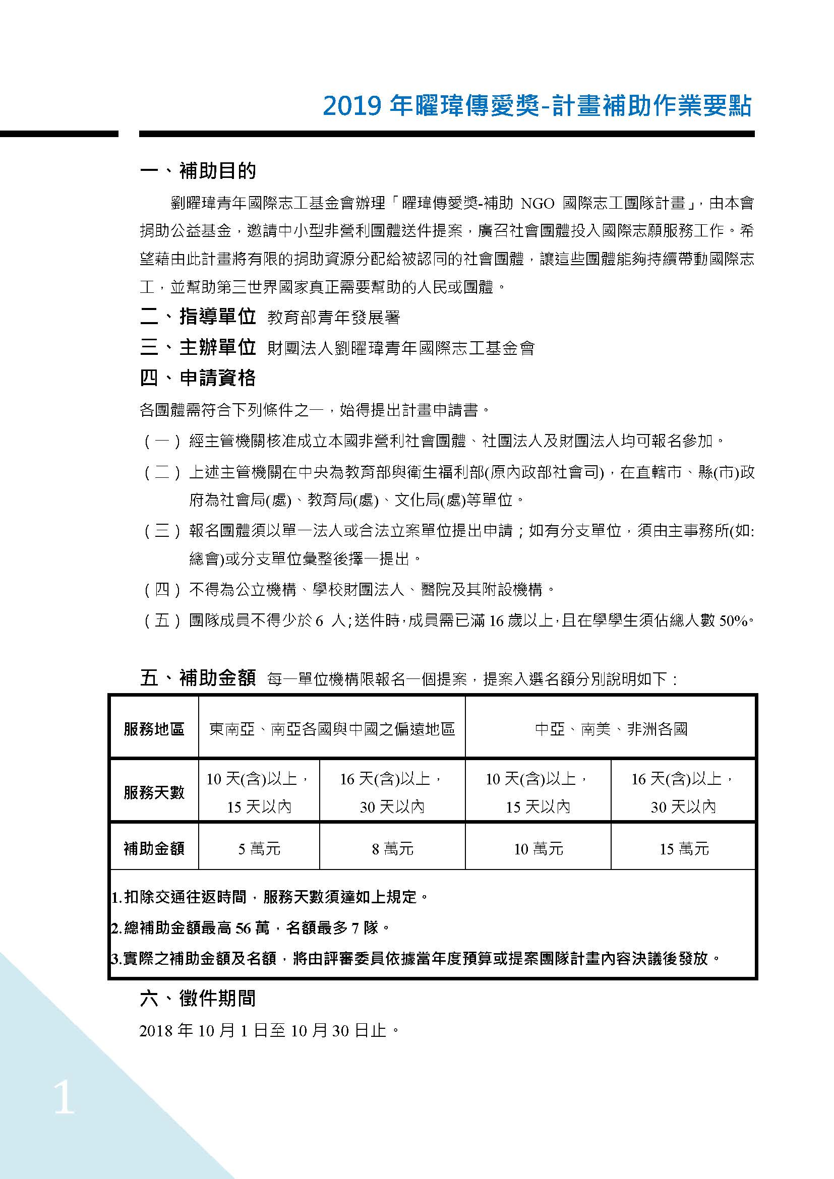 「曜瑋傳愛獎-補助NGO國際志工團隊計畫」計畫補助作業要點