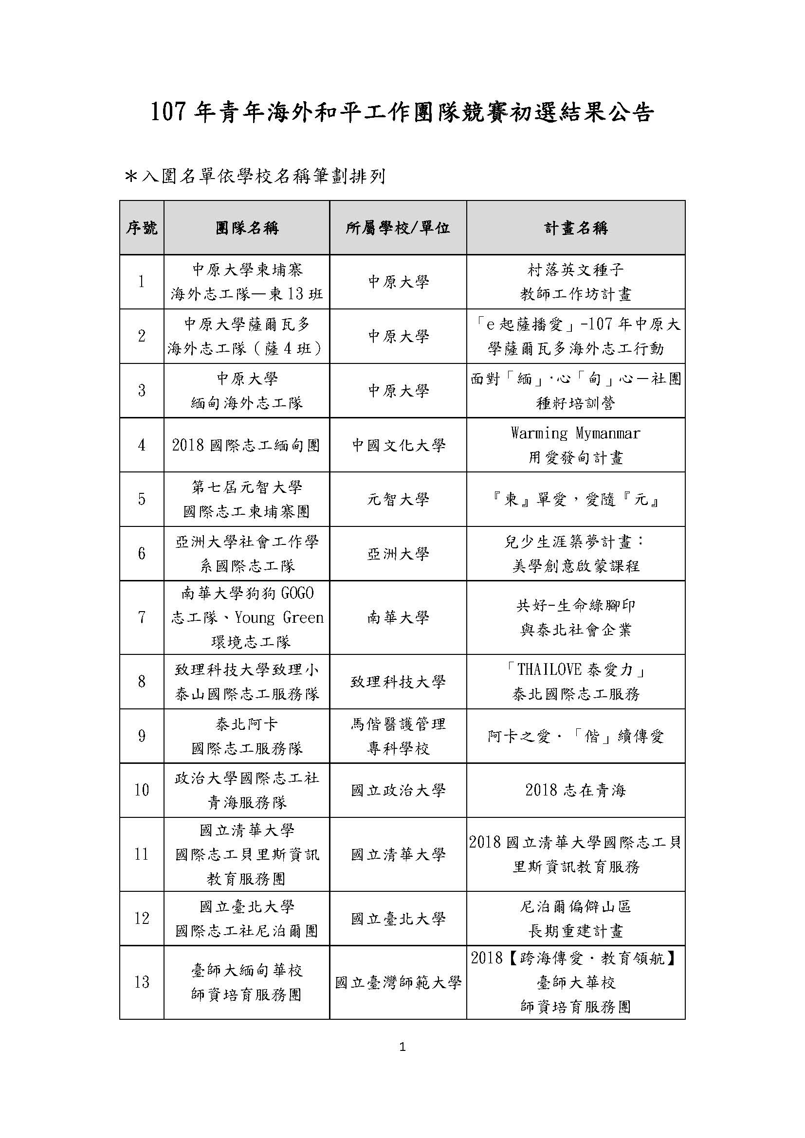 107年青年海外和平工作團隊競賽初選結果公告名單1