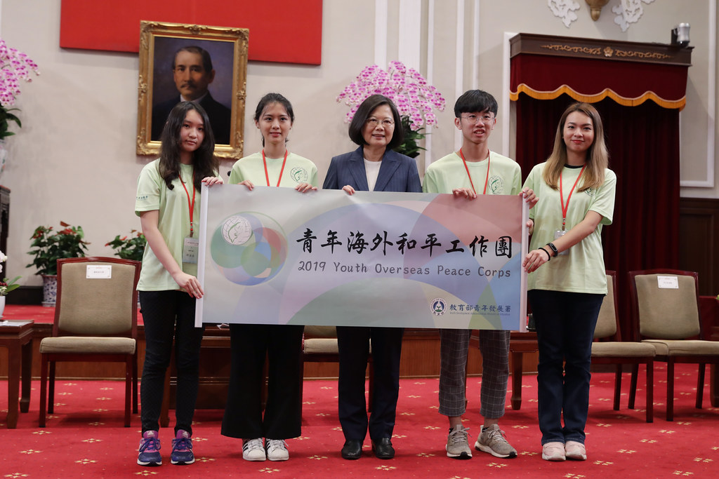 今年暑假,教育部青年署補助143隊、1,411名青年飛往25個國家服務,和去年相較,增加了45隊、411名;為激勵這些今年即將飛往海外之青年志工,今日共141名大專校院及非營利組織之青年海外志工代表,由教育部潘部長陪同,一同走進總統府。蔡總統表示表示成立青年海外和平工作團的目的,就是希望青年透過海外志願服務來規劃職業生涯發展,並發揮自身專長,實現國民外交,總統身為榮譽團長,會成為支持青年的後盾。海外服務能拓展人生經驗,增加和其他國家的情誼,總統也勉勵在場青年成為臺灣的代言人,發揮創新與創意,為世界帶來改變,回國後,能把自己的服務經驗分享出去,鼓勵周遭的青年朋友,一起投入海外志工的行列。而今年有112個團隊前往11個新南向國家服務,跟新南向國家建立廣泛、多元的策略夥伴關係。