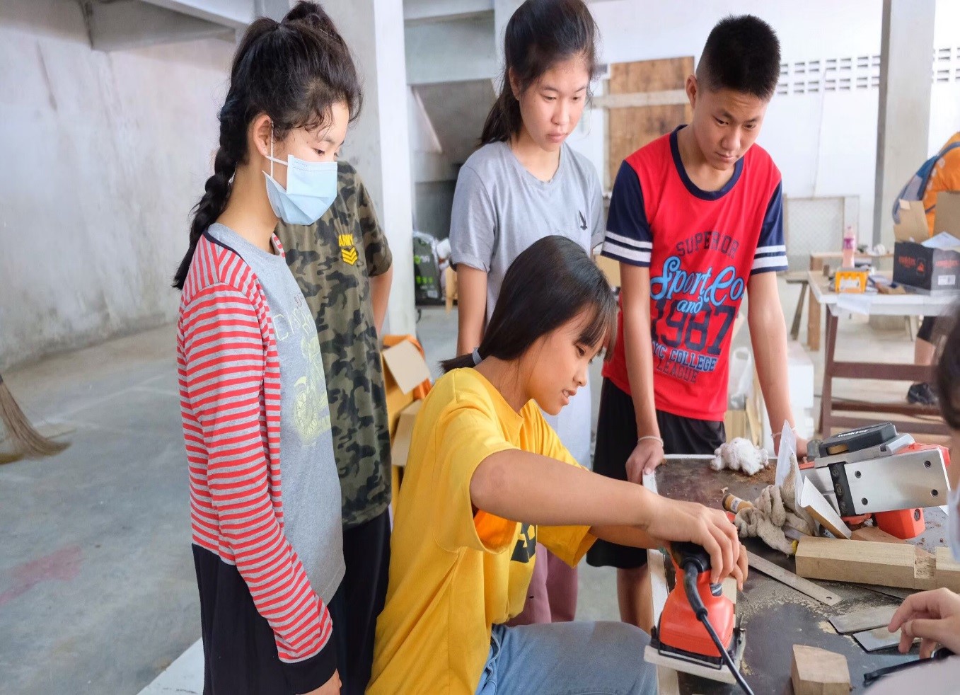 泰北大同中學幼兒園教室不僅課桌椅數量不足,且原有課桌椅完全相連,高度及深度無法配合學生的年齡、高矮調整使用,不適合成長發展中的學童,在地亦缺乏專業的木工人力。青年志工團隊評估這些課桌椅皆為實木,維修及改造後仍可使用多年,故篩選原有桌椅較完整及破損程度小的,進行修復和拆解再造,不足的數量再購置材料重新製作。此外,為了使校方日後也能自行修繕,甚至讓學生擁有技藝專長有助於未來生涯發展,團隊更利用校園閒置空間作為木工工具室,教導校內的師生具有基本的木工知識,使他們學會工具操作木工設備及維修木桌椅。