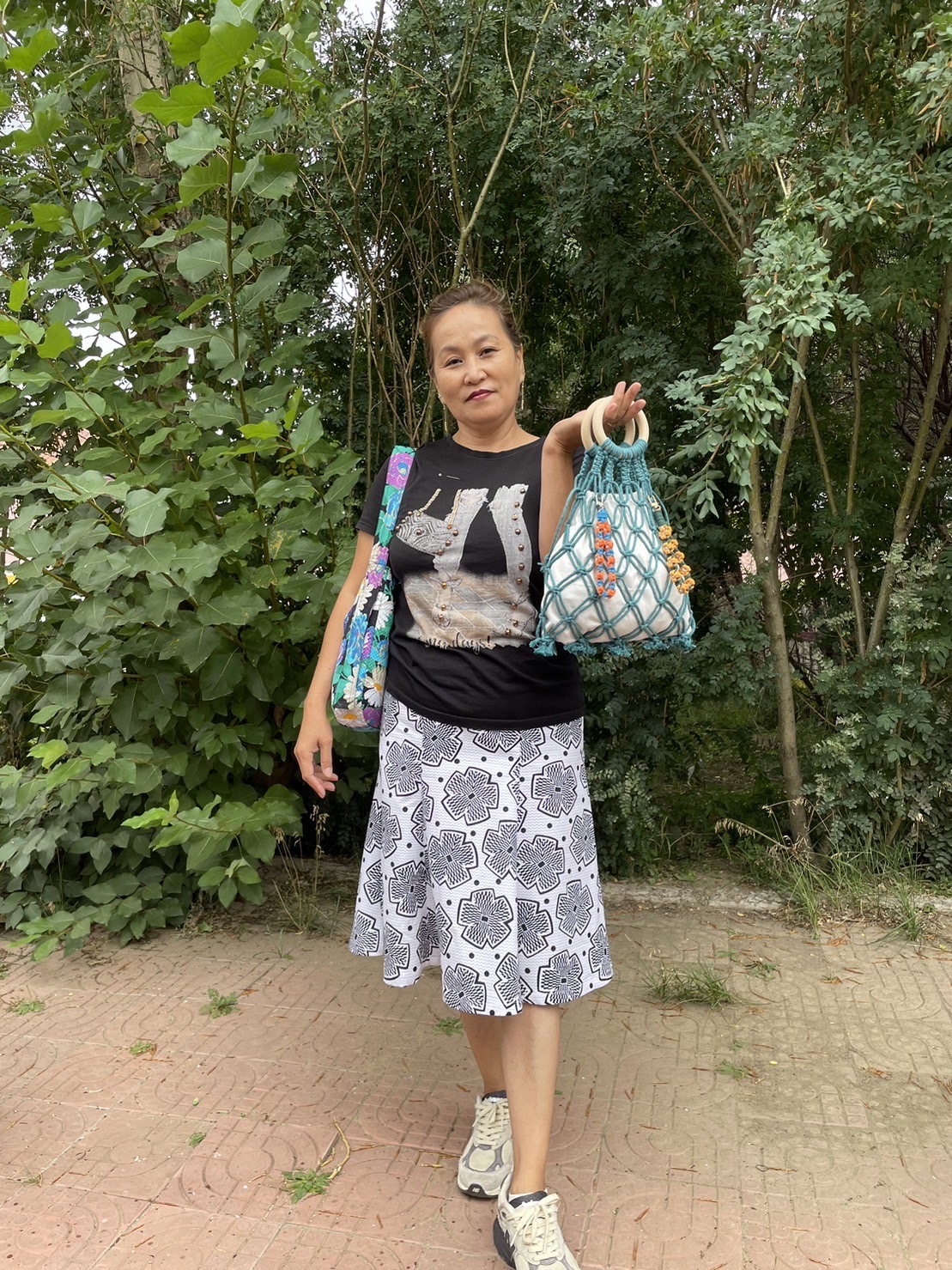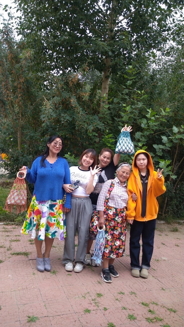 caritas成果秀 我和學姊與成員們和奶奶和合照。(奶奶 右2 /詹梓勤 右1) 奶奶穿著自己做的裙子,背著自己做的包包,和手邊提袋。(左2,古楚涵)