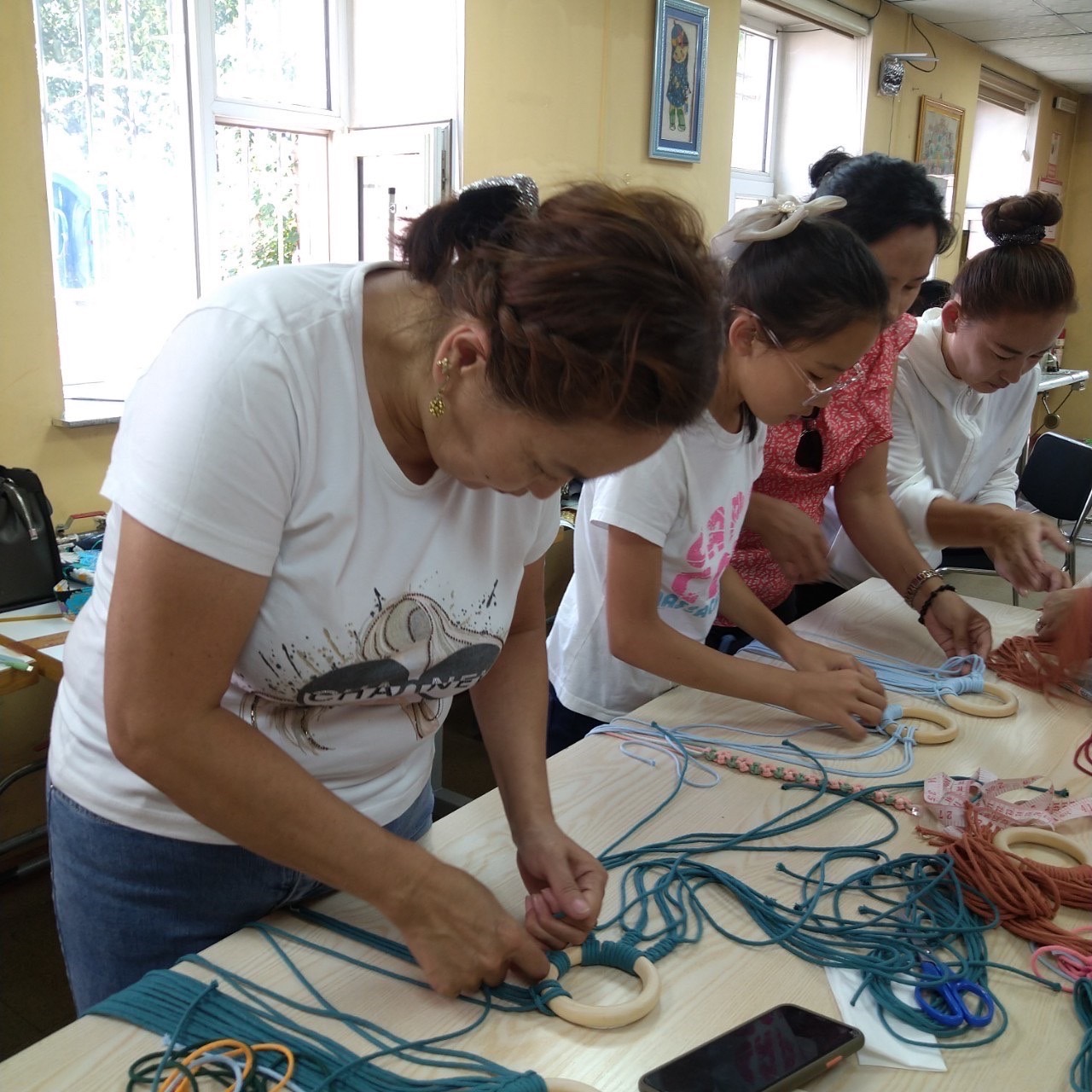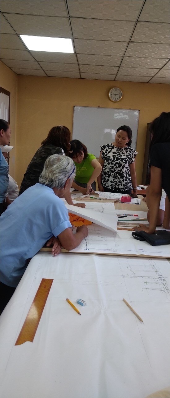 和與caritas婦女們解釋打版的古楚涵(中間綠色衣服)。