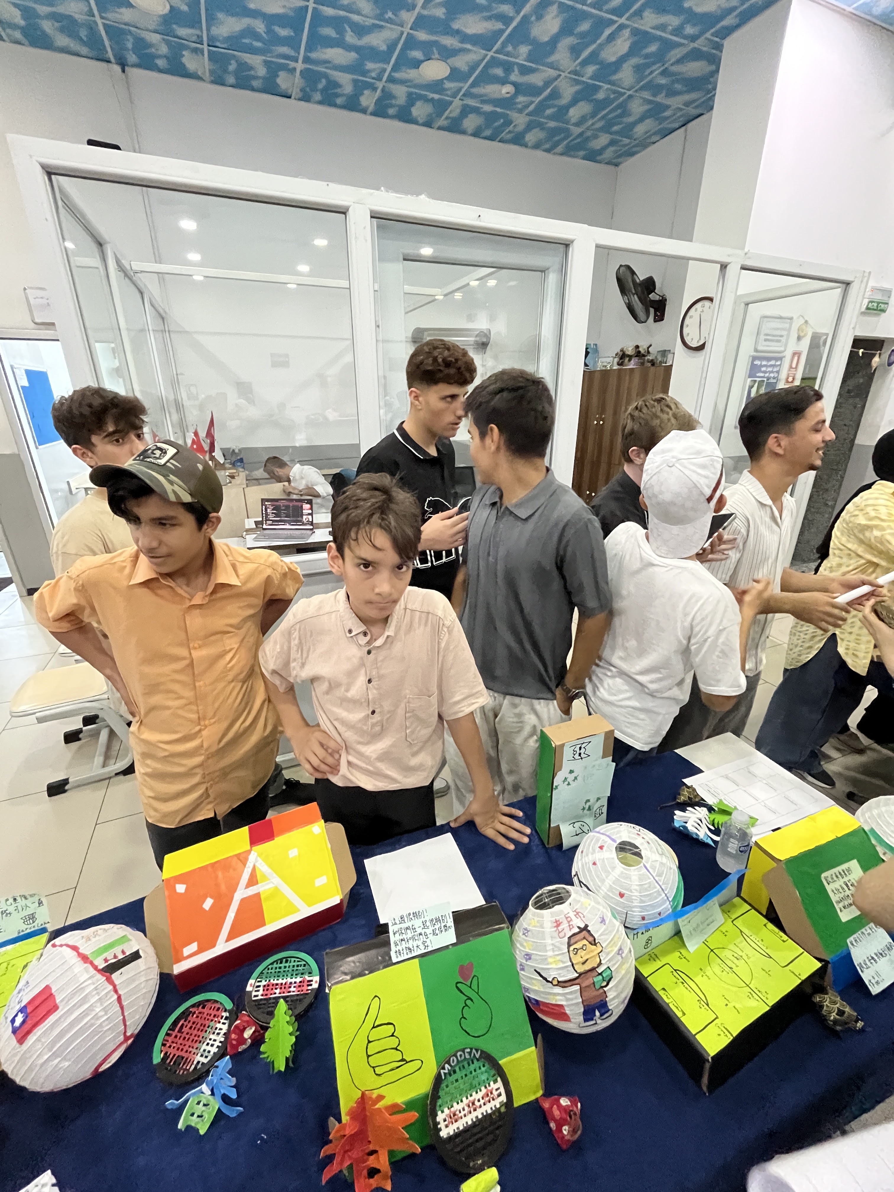 學生的成果展。在課程的最後一日,學生展示出前面幾日課堂所完成的作品,並擔任講解員,向來觀的同學、老師練習用中文及英文解釋創作理念。