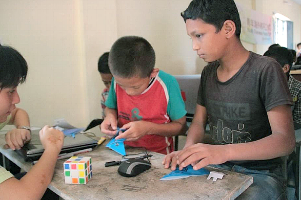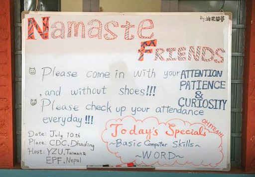 元智大學的尼泊爾團,主要服務內容是資訊教育,所以我們準備了很多軟體要教他們,不過假如每天都上資訊課程,就像在大學時,每天都上必修課程一樣,會覺得很煩,所以我們還安排一些創新課程,可以讓整趟營期不會那麼枯燥無味。照片中是在上創新課程中的剪紙課 ,這堂課剛好是我和另外一位團員負責的,內容是教他們剪中文字,中間的小男孩是想挑戰剪囍,這字不好剪,要使用美工刀,所以他很小心翼翼的拿著自己的色紙及刀,慢慢割慢慢撕。而坐在前他前面的我,看到他完成後興奮的表情,覺得自己準備那麼久的課程值得了。這次的營期,我們把它分為基礎營及進階營兩部分,而這張照片是在進階營時拍的。經過一個星期的資訊課程後,最後一天,我們舉辦了成果展,讓每個小朋友都要上台發表自己在營期學到的東西,不管用甚麼軟體都可以,只要是我們所教的,並可以用電腦完成的都可以。而當時的我,被分配到黃隊,當一個可以適時幫助他們的助手。黃隊的主題是song,一開始他們用 apowersoft 打自我介紹,討論期間,大家都很樂在其中,討論的非常熱烈,所以覺得他們很棒,非常期待他們的成果,雖然最後知道他們選的歌是國歌,讓我有點傻眼,但看到這麼愛國的小朋友們,也為他們感到驕傲。黃隊最棒!!!