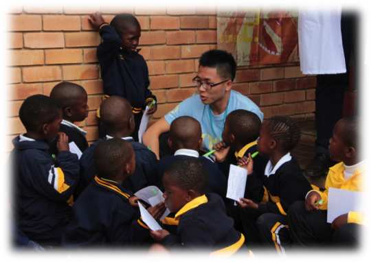 孩子們認真而好奇地聽著口腔衛教,然後開心的和我們分享史瓦濟蘭生活的點滴。(圖中為隊長范姜敦群)