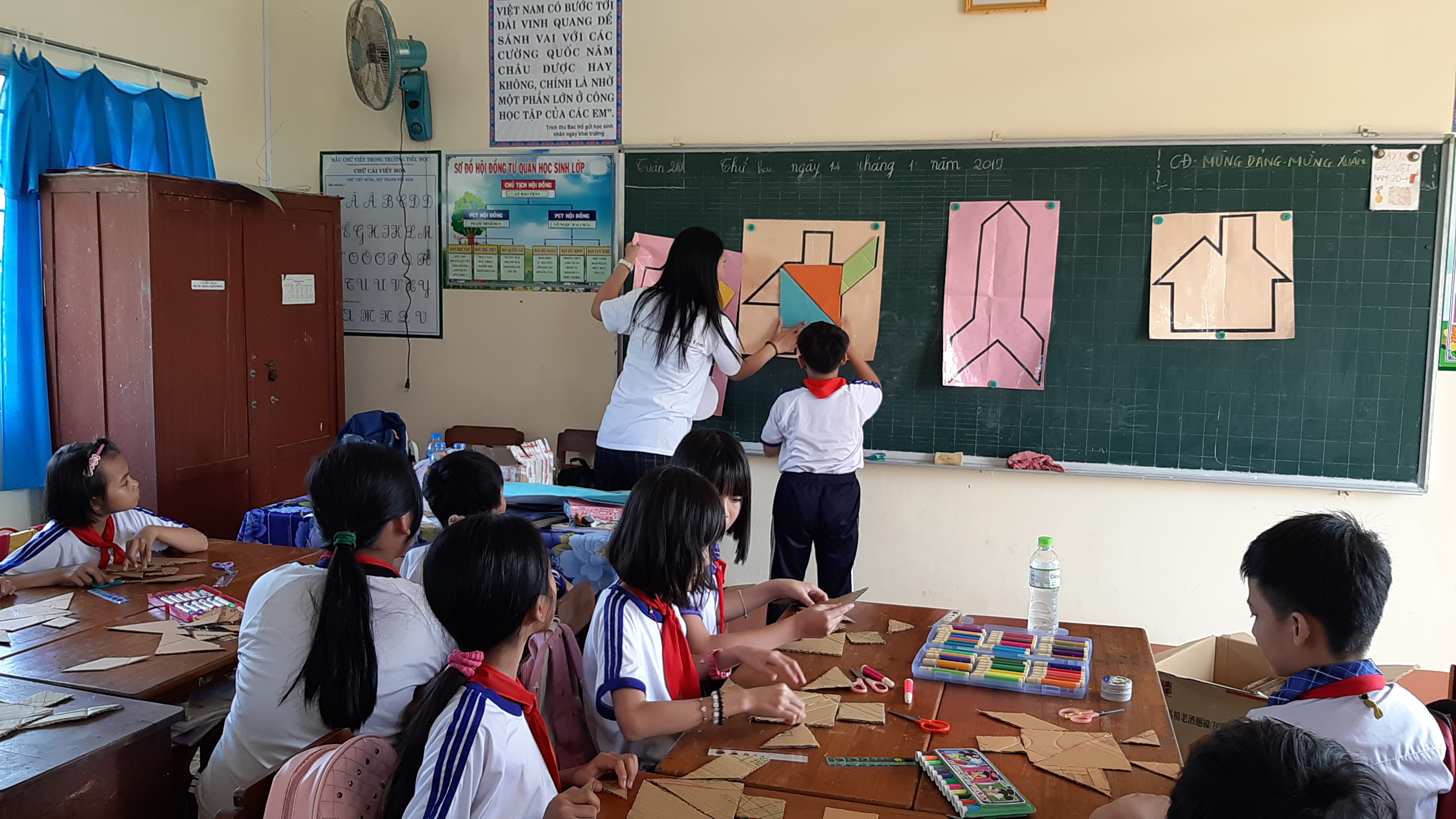 讓第一個拚出七巧板圖形的孩子上台為大家解答