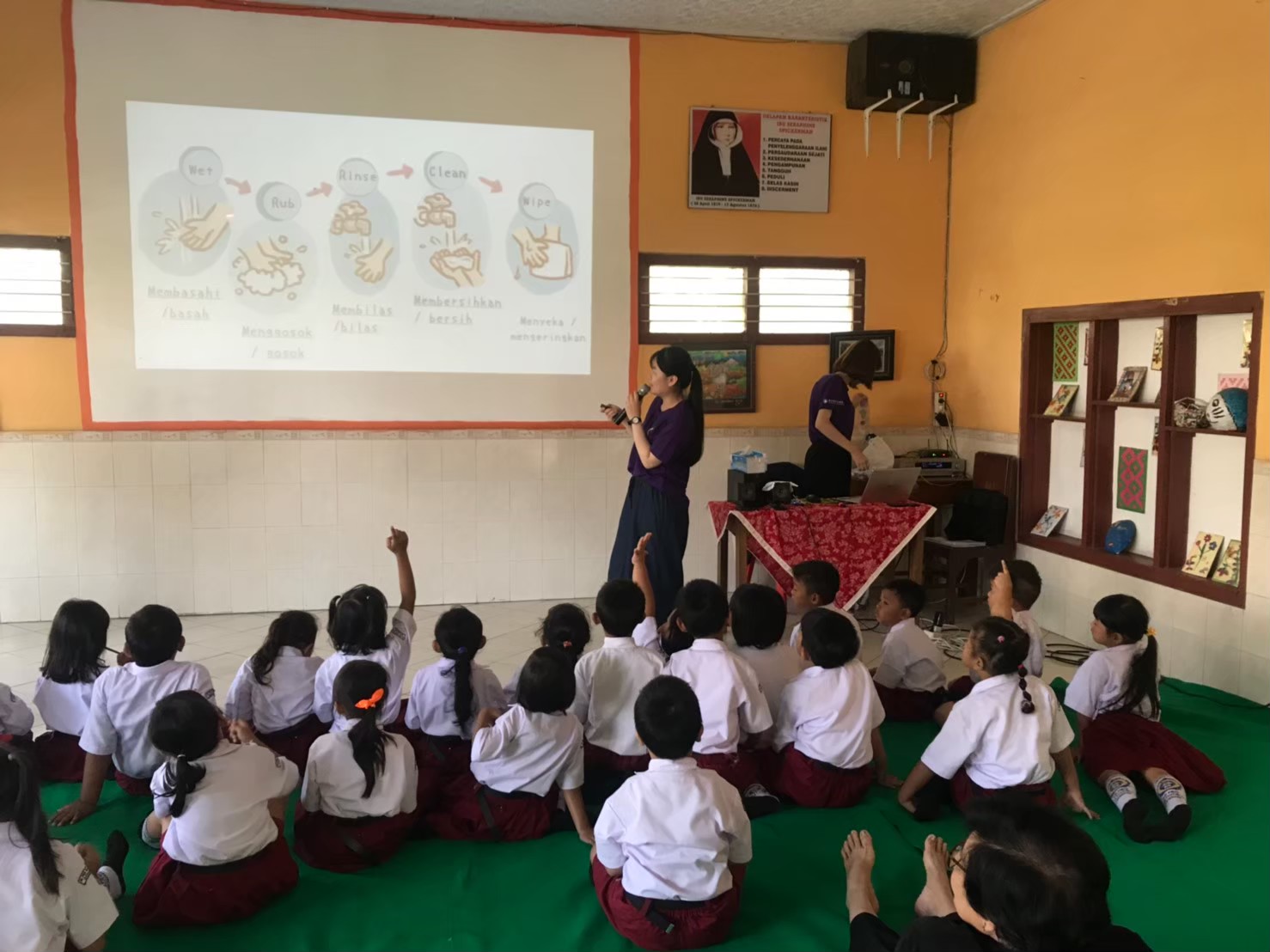 圖中站在投影幕前講解洗手課程的是我,劉琬儀。國小的學生們會跟著我們講解的步驟重新複習洗手的動作。